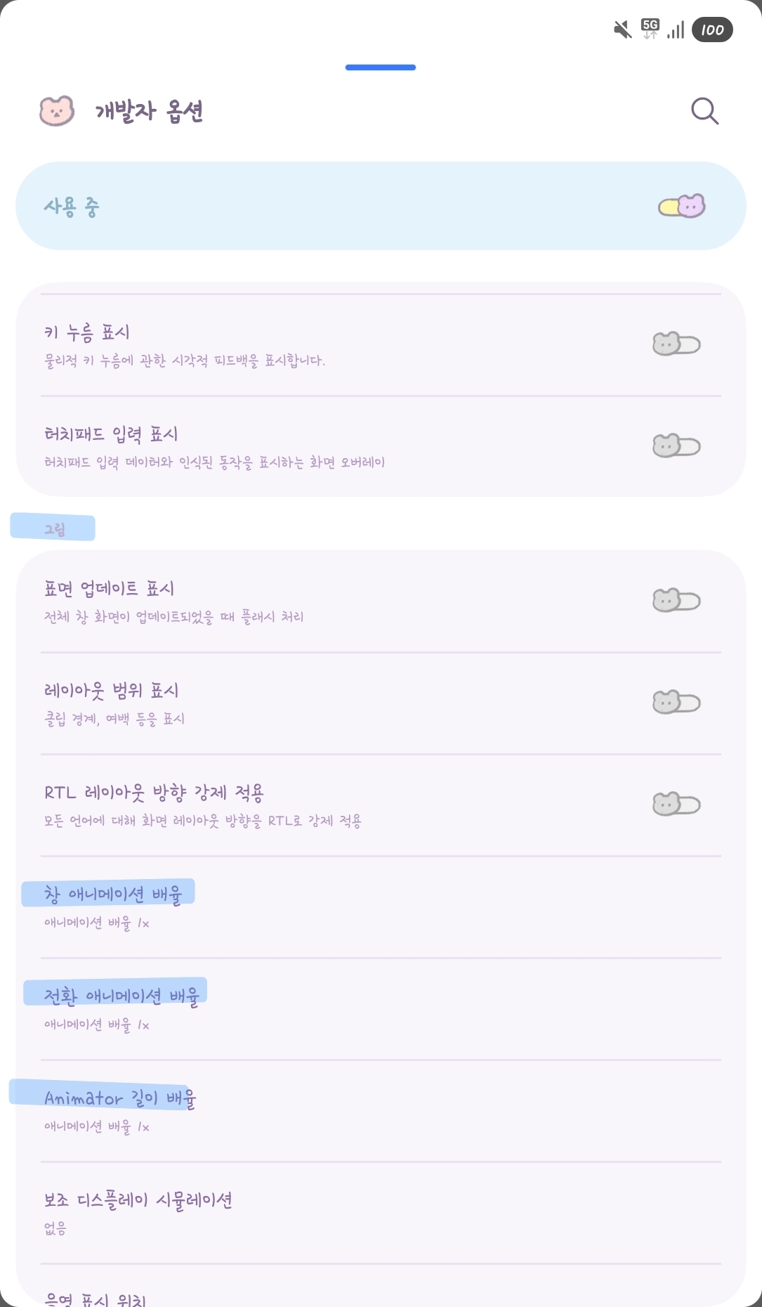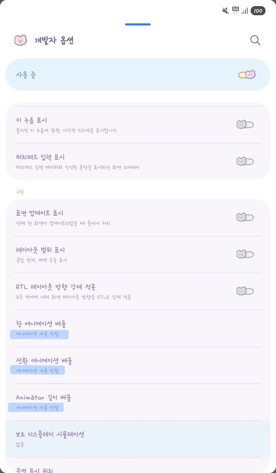 개발자 옵션 메뉴에서 아래 항목을 찾아 모두 ‘사용 안 함’으로 변경하세요.