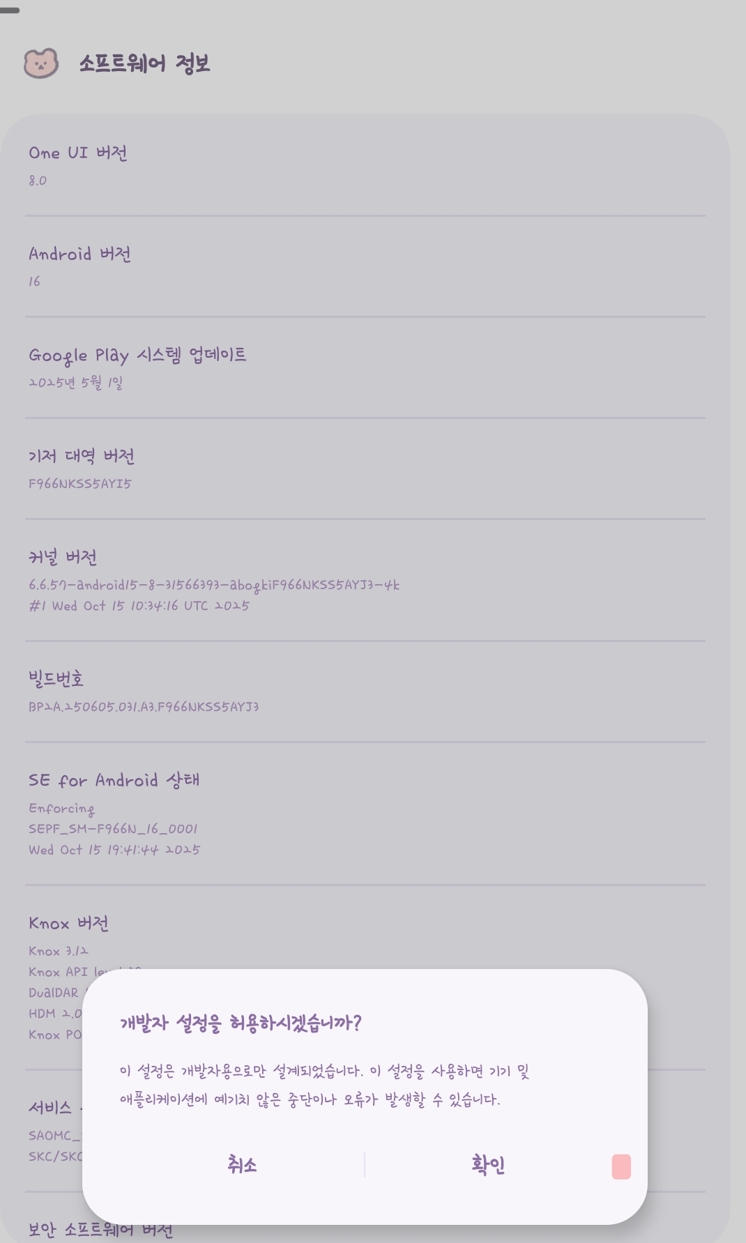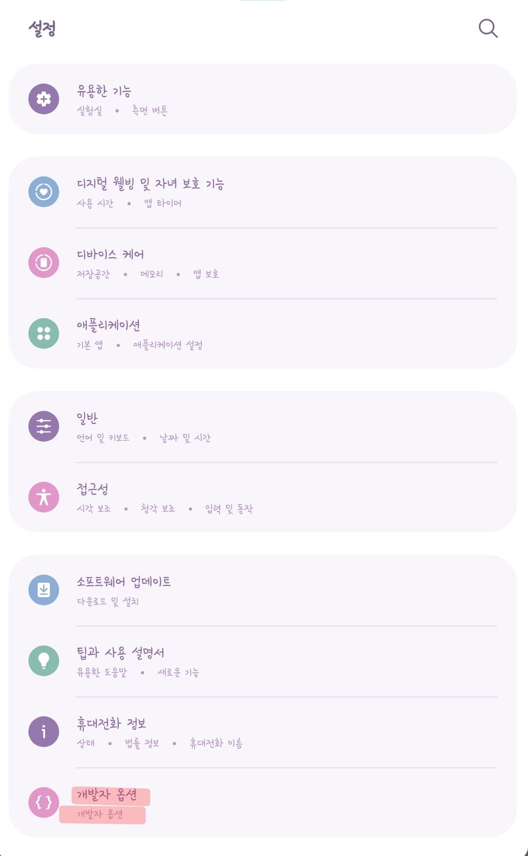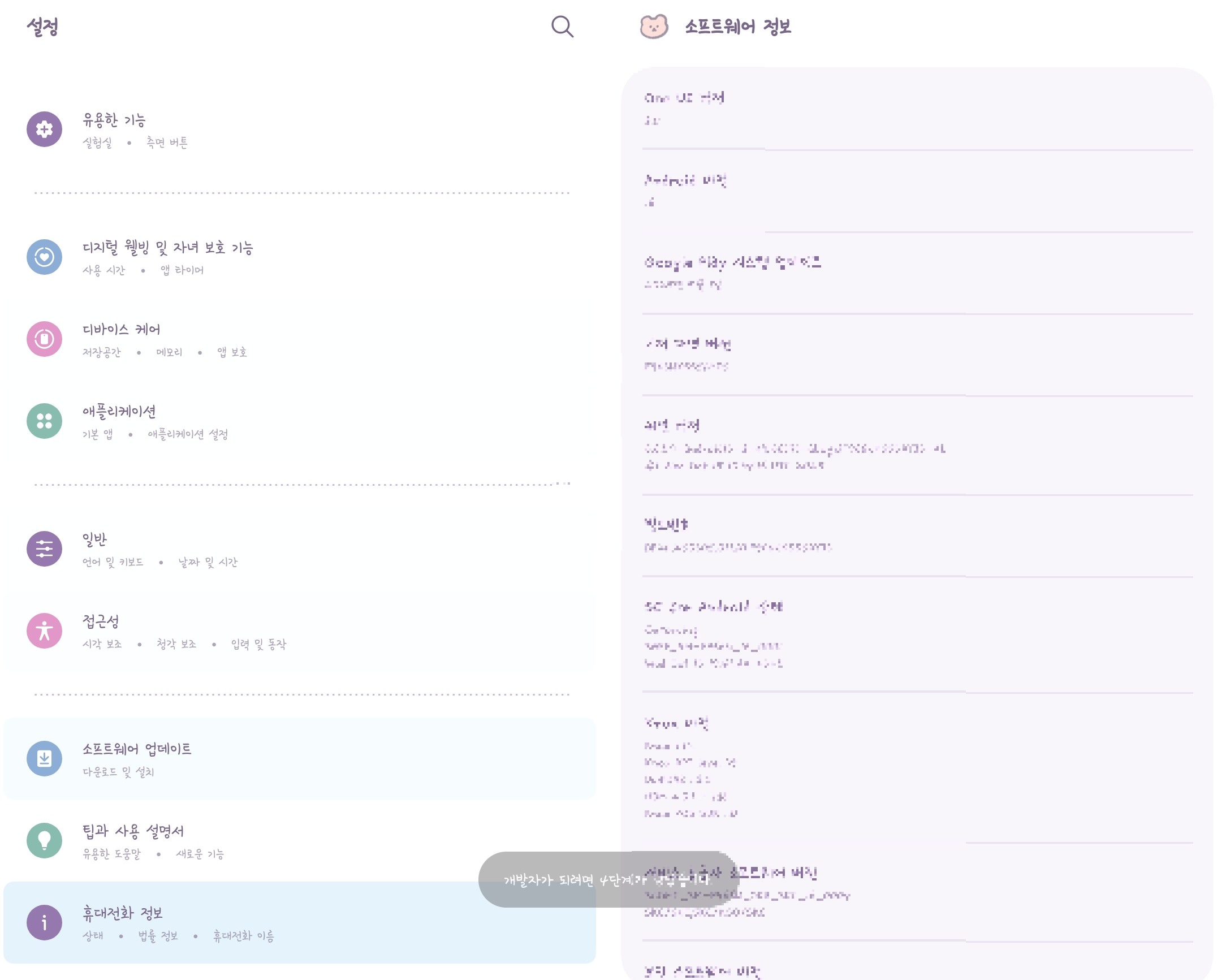 이후 설정 → 휴대전화 정보 아래쪽에 ‘개발자 옵션’ 메뉴가 생깁니다.