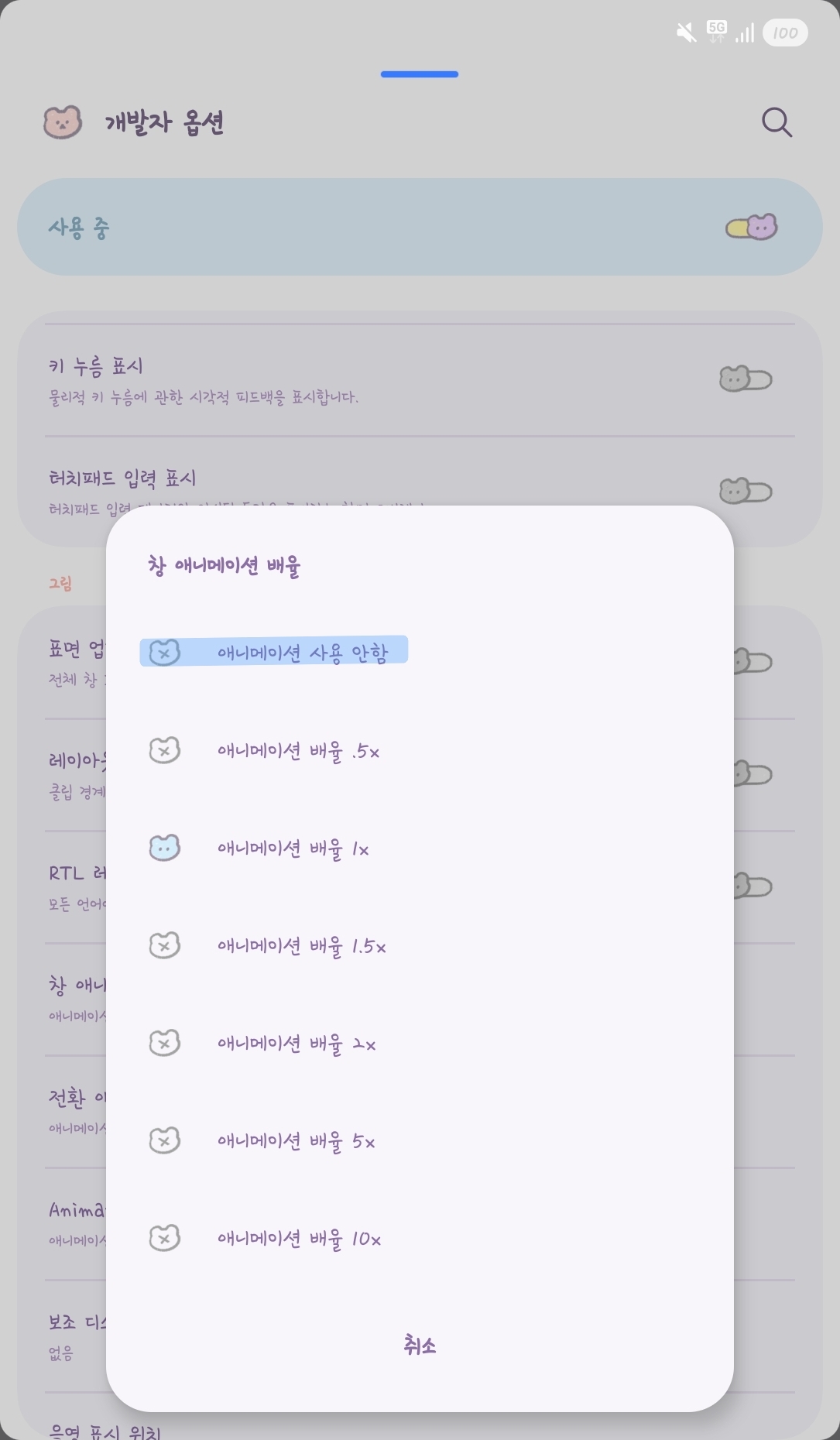 - 창 애니메이션 배율 → 사용 안 함